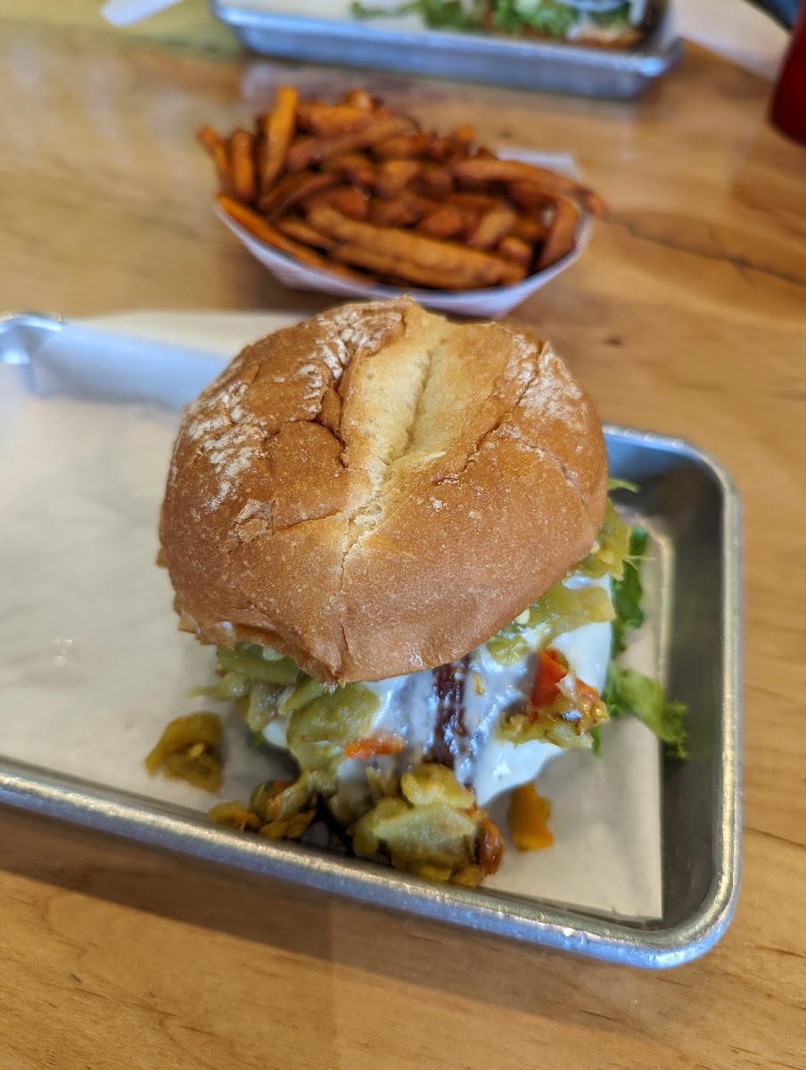Grassburger with Green Chile on a Gluten Free Bun with Sweet Potato Fries